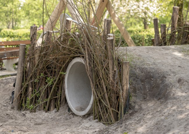 Een speelheuvel met kruipbuis in een speeltuin of op het schoolplein is divers te gebruiken. Kinderen kunnen erdoorheen kruipen, zich verstoppen, over de heuvel heen rennen of er vanaf rollen.